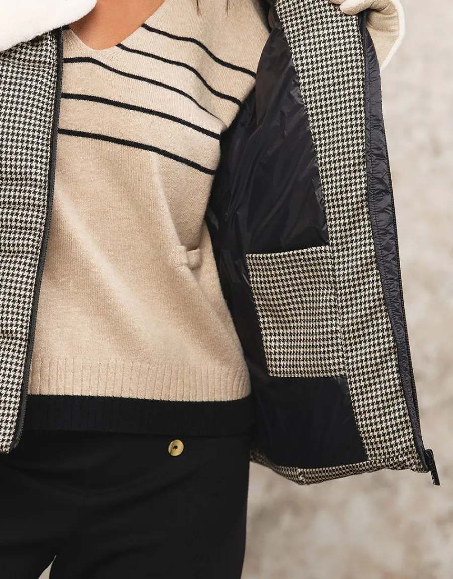 – Imprimé pieds de poule noir et beige avec insertion de fil doré
