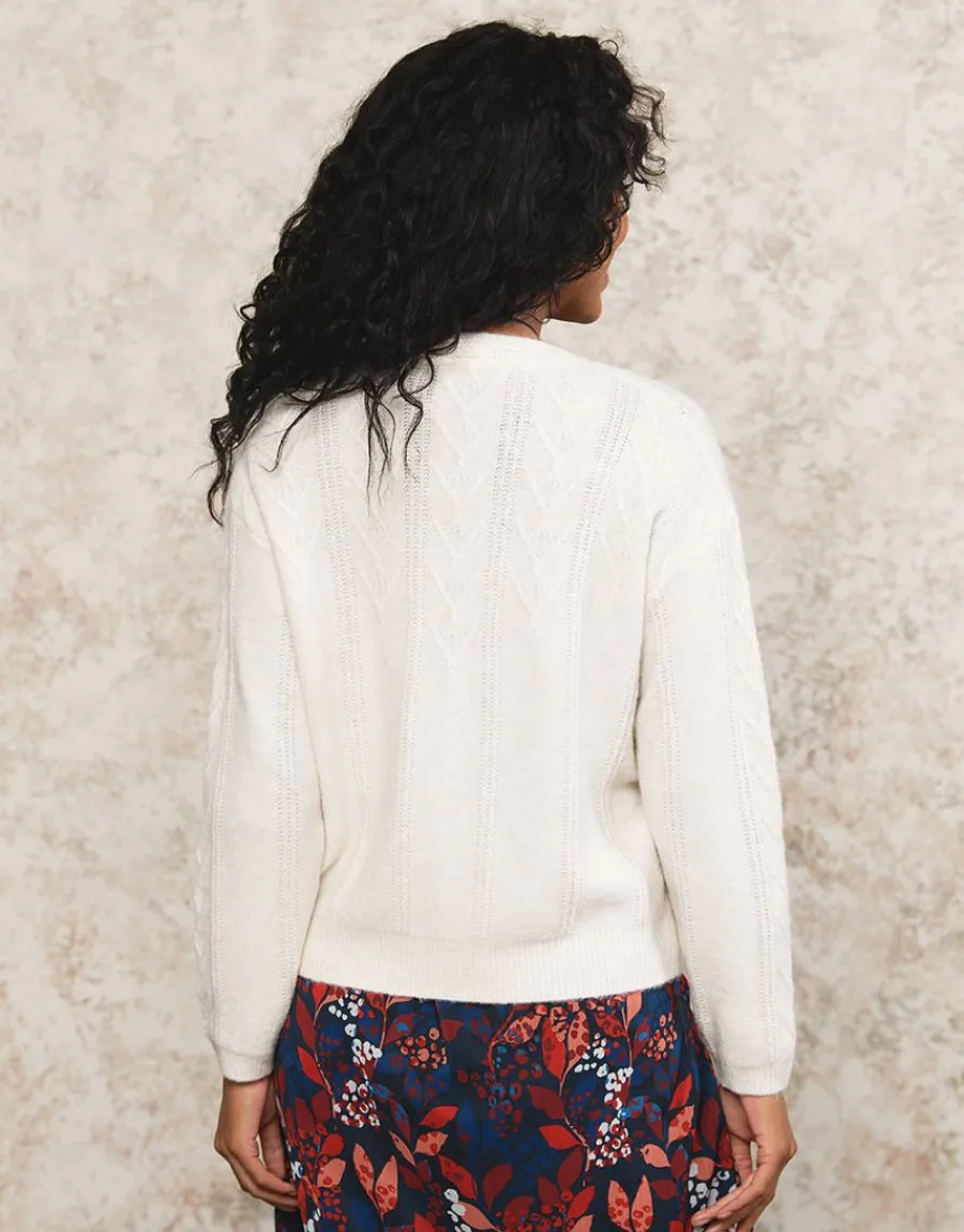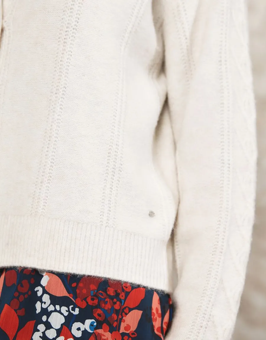Le gilet chaud en maille écru est un incontournable de la garde-robe hivernale. Sa coupe ample et ses manches longues tombantes apportent une touche décontractée et confortable. L’encolure en V et la fermeture par 5 gros boutons métalliques ajoutent une touche d’élégance à ce gilet. La touche de laine dans sa composition le rend encore plus chaud et agréable à porter. Ce gilet se distingue par son jeu de torsades sur les épaules, qui lui donne un aspect raffiné et original. Sa maille douce, chaude, épaisse et stretch en fait un vêtement parfait pour affronter les journées fraîches de l’hiver. Polyvalent, il peut être porté en toutes occasions, que ce soit pour une journée décontractée à la maison ou pour une sortie entre amis. Mesurant 1,76m, Kristell porte une taille 1 de ce gilet, ce qui permet de se faire une idée de la longueur de 58 cm pour cette taille. Avec une composition de 63% polyester, 28% acrylique, 5% laine et 4% élasthanne, ce gilet allie confort, chaleur et qualité. Ajoutez-le à votre collection de vêtements d’hiver pour rester stylée et bien au chaud tout au long de la saison.