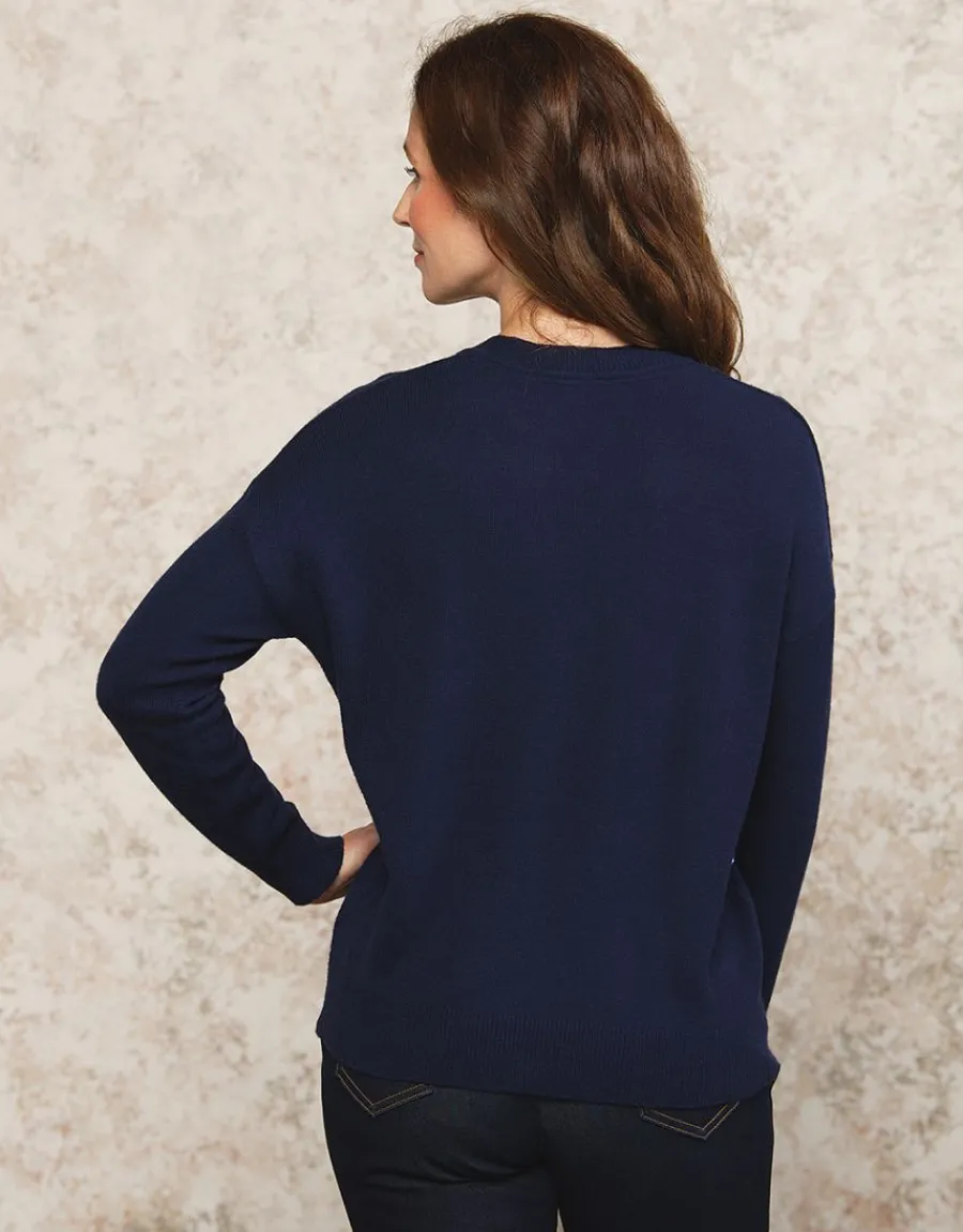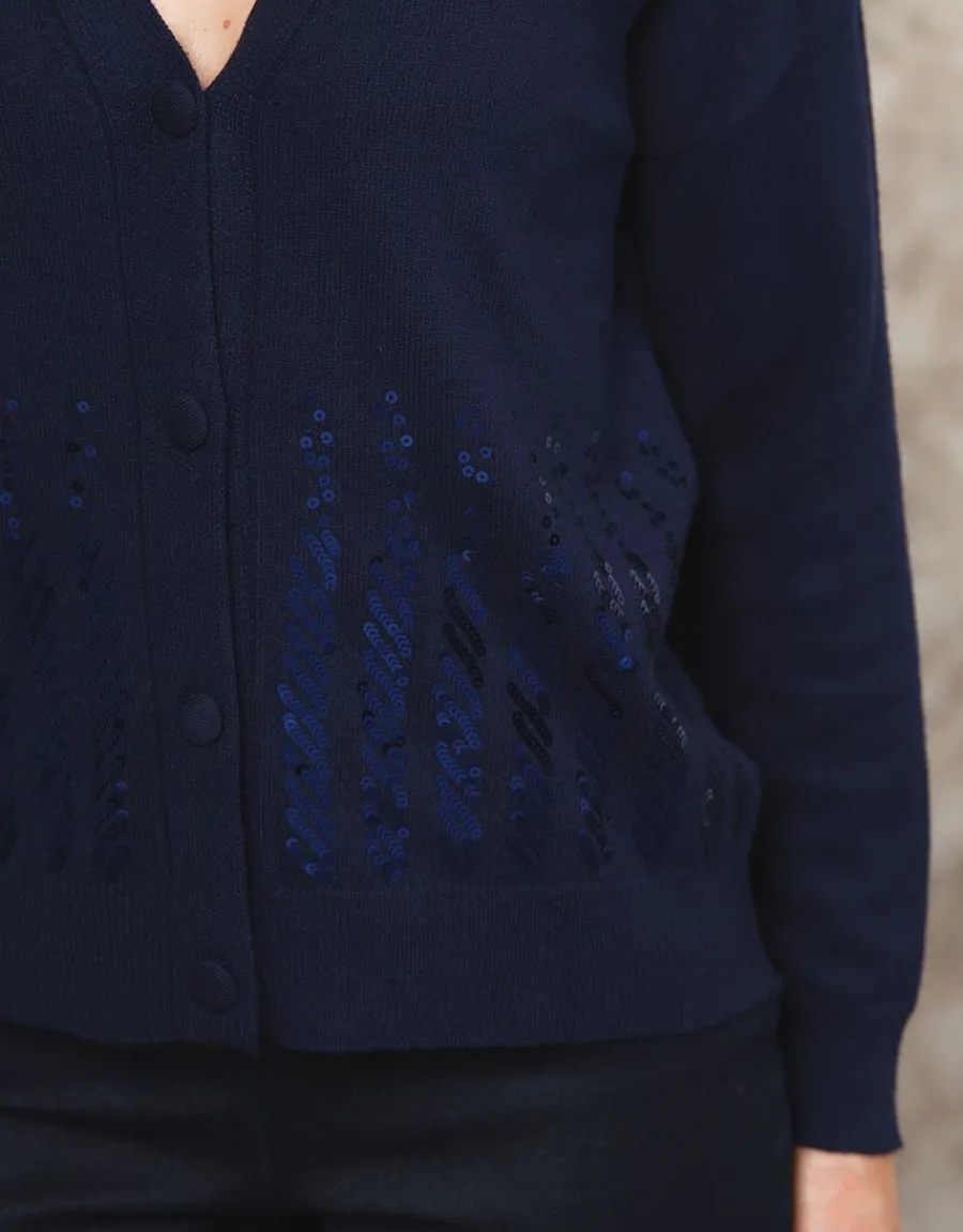 Craquez pour ce gilet bleu marine, un incontournable de la garde-robe pour les journées fraîches. Sa coupe légèrement loose apporte une touche décontractée et tendance à votre tenue. La maille fine jauge de ce gilet est à la fois chaude et confortable, idéale à porter directement sur la peau. La maille douce offre un aspect naturel et agréable au toucher. Les boutons recouverts ajoutent une touche d’élégance discrète, tandis que le jeu de sequins ton sur ton sur le devant apporte une touche de brillance subtile. L’encolure en V cranté et les emmanchures basses donnent une allure moderne à ce gilet. Les manches longues offrent une protection supplémentaire contre le froid. Cette pièce est non seulement esthétique, mais aussi très confortable à porter grâce à sa matière de qualité. La nouvelle forme de ce gilet loose bleu marine donne une allure élancée et féminine à celle qui le porte. Ce gilet est parfait pour compléter une tenue décontractée chic ou pour ajouter une touche de style à un look plus formel. Il s’adaptera à toutes les occasions et vous accompagnera tout au long de la journée. Kristel, qui mesure 1,76m, porte du 38 et met en valeur ce gilet avec élégance. La composition de ce gilet est un mélange de 52% viscose, 31% polyester et 17% polyamide, garantissant à la fois douceur, chaleur et résistance. Sa longueur de 57 cm pour la première taille est idéale pour une coupe loose et confortable. Ce gilet bleu marine est un indispensable de la saison, à la fois pratique et stylé.