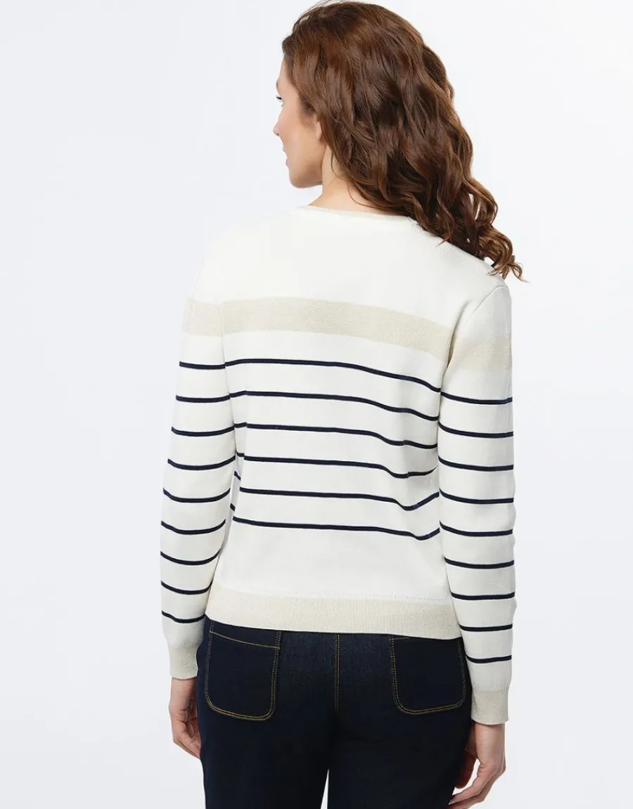Découvrez le gilet marinière col V de Christine Laure, une pièce élégante qui marie confort et style. Son design à la fois classique et moderne se distingue par sa coupe droite et ses manches longues, offrant une silhouette flatteuse. Réalisé dans une maille compacte, ce gilet présente des rayures inspirées du style marin, agrémentées d’un subtil fil métallisé doré qui lui confère une touche d’éclat. L’ouverture avant est dotée de cinq boutons, soulignant le soin apporté aux détails. De plus, deux rabats de poche ornés de boutons argentés ajoutent une note de sophistication à l’ensemble. Mesurant 58 cm de longueur pour la taille 1, il convient parfaitement à différentes morphologies. Que ce soit pour une tenue décontractée ou un look un peu plus chic, ce gilet s’adapte aisément à toutes les occasions. Sa composition garantit à la fois confort et durabilité. Kristel, mesurant 1,76 m, le porte en taille 1, illustrant ainsi l’ajustement idéal. Ce gilet est un choix parfait pour celles qui cherchent à allier style intemporel et modernité dans leur garde-robe.