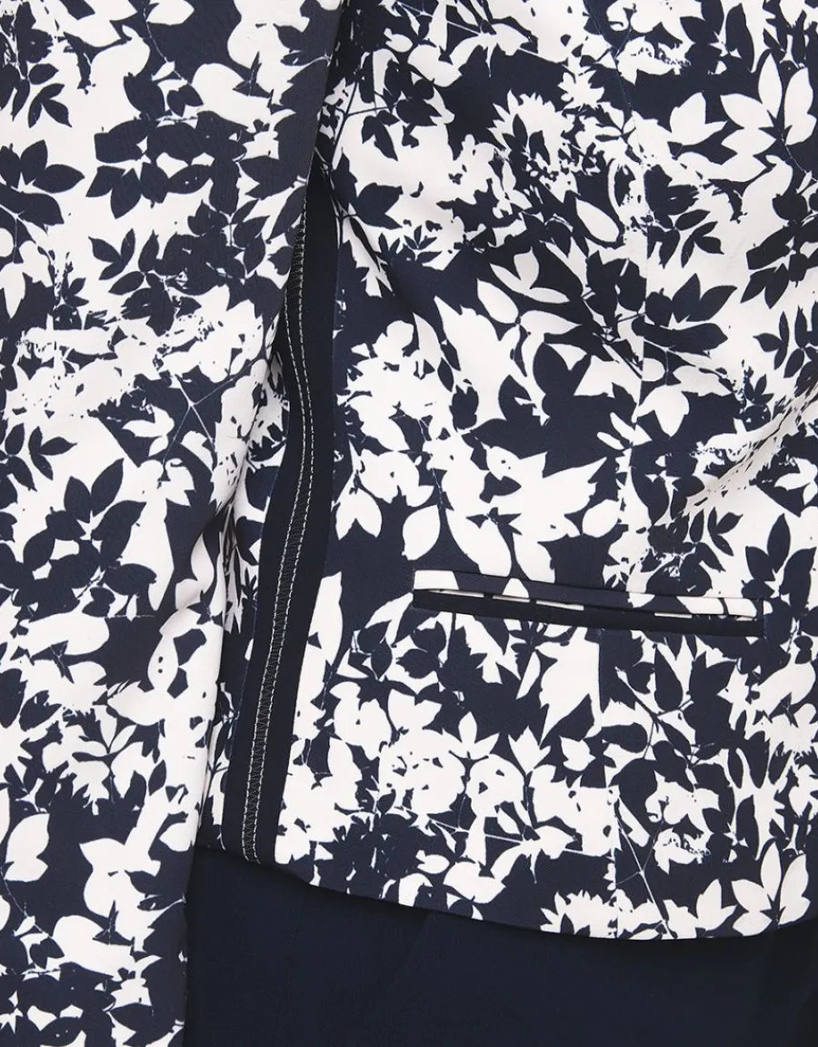 – Un imprimé feuillage bleu marine foncé et beige très élégant, voilà une veste chic à porter pour toutes les saisons
