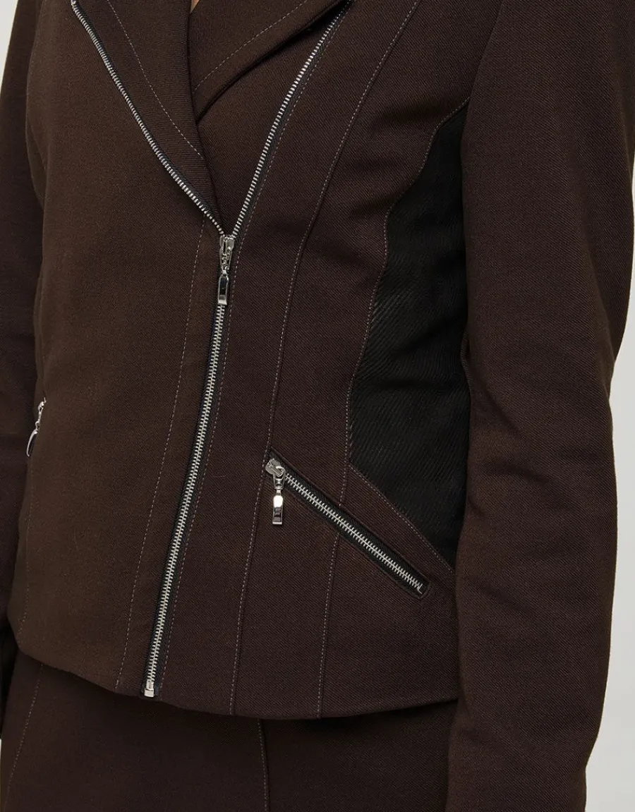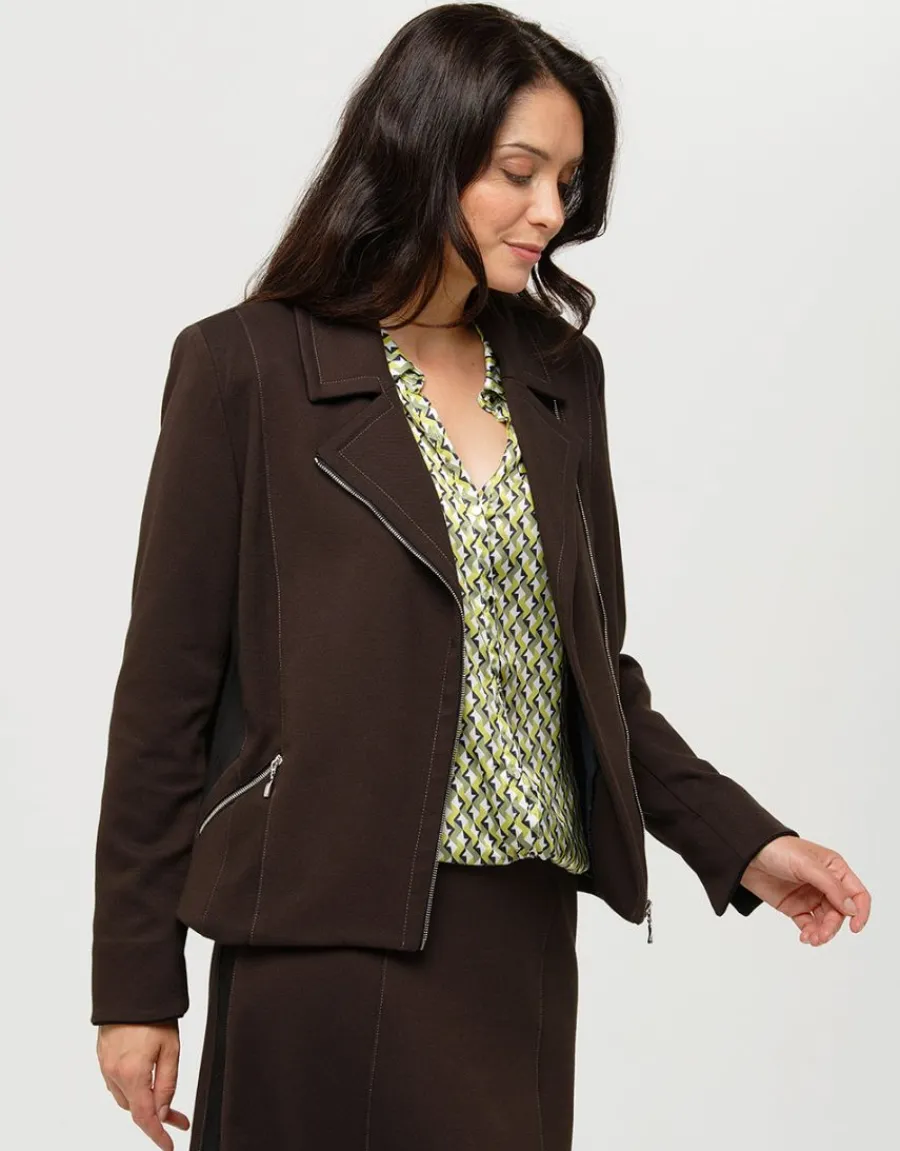 La veste marron bi-matière à zips argents, dispose d’une coupe droite avec des surpiqures contrastées, un col droit et des revers. Les côtés sont confectionnés dans un tissu stretch avec un effet strié pour apporter une touche d’originalité. Les manches longues et les deux poches zippées au bas ajoutent une touche pratique à ce vêtement. Le détail mode de cette veste réside dans le jeu des matières et des couleurs, offrant un rendu très original. À la fois rock et chic, cette pièce bi-matière saura s’adapter à tous les styles. Pour un look élégant et sophistiqué, cette veste peut être assortie à la jupe marron (23HE0587022) pour former un ensemble tailleur parfaitement coordonné. Avec une longueur de 60 cm du haut de l’épaule jusqu’en bas pour la première taille, cette veste convient à toutes les morphologies. La composition de ce vêtement est majoritairement en polyamide, viscose et élasthanne, avec une garniture en polyester et élasthanne, ainsi qu’une doublure en polyester. Portée par Emma qui mesure 1,76m et porte du 38, cette veste bi-matière marron est un incontournable de la garde-robe féminine. Son style unique et sa polyvalence en font un choix idéal pour toutes les occasions, que ce soit pour une journée de travail ou une soirée entre amis. Optez pour cette veste pour ajouter une touche d’originalité et de sophistication à votre tenue.