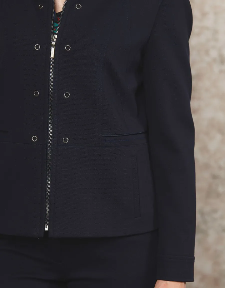 La veste tailleur marine est un incontournable de votre garde-robe. Confectionnée dans un élégant sergé stretch façon Milano, elle offre un tombé impeccable et une grande liberté de mouvement. Les découpes soigneusement placées à l’avant et à l’arrière soulignent la silhouette avec finesse, tandis que la coupe droite apporte une touche de modernité. Le col en pointe et les poches discrètes à l’avant ajoutent une note sophistiquée à l’ensemble. La doublure unie fantaisie apporte une touche d’originalité à cette pièce classique, tandis que les finitions invisibles témoignent du souci du détail apporté à sa réalisation. Cette veste est confectionnée dans une matière qui saura vous séduire par son confort inégalé et son élégance intemporelle. Portée par Kristel, qui mesure 1,76m et porte du 38, cette veste tailleur marine est disponible dans différentes tailles pour s’adapter à toutes les morphologies. Composée à 47% de viscose, 46% de polyamide et 7% d’élasthanne, elle assure une grande souplesse et une excellente tenue. Sa doublure en polyester garantit un confort optimal tout au long de la journée. Avec une longueur de 58 cm pour la première taille, cette veste tailleur marine se porte aussi bien avec un pantalon de tailleur assorti pour un look professionnel impeccable, qu’avec un jean et des baskets pour une allure décontractée et tendance. Polyvalente et élégante, elle s’adapte à toutes les occasions et vous accompagne avec style en toutes circonstances.