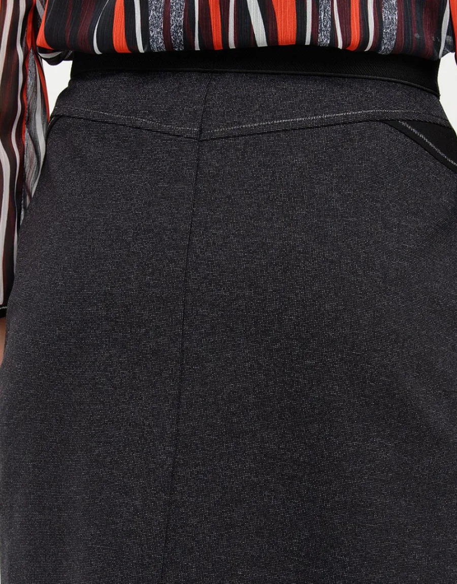 – La jupe droite se renouvelle avec un effet patchwork vertical indéniablement amincissant