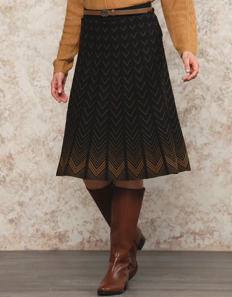 – Une longueur midi tendance, une maille au tombé impeccable, un motif chevron moderne, un mix couleur noir/camel facile à assortir