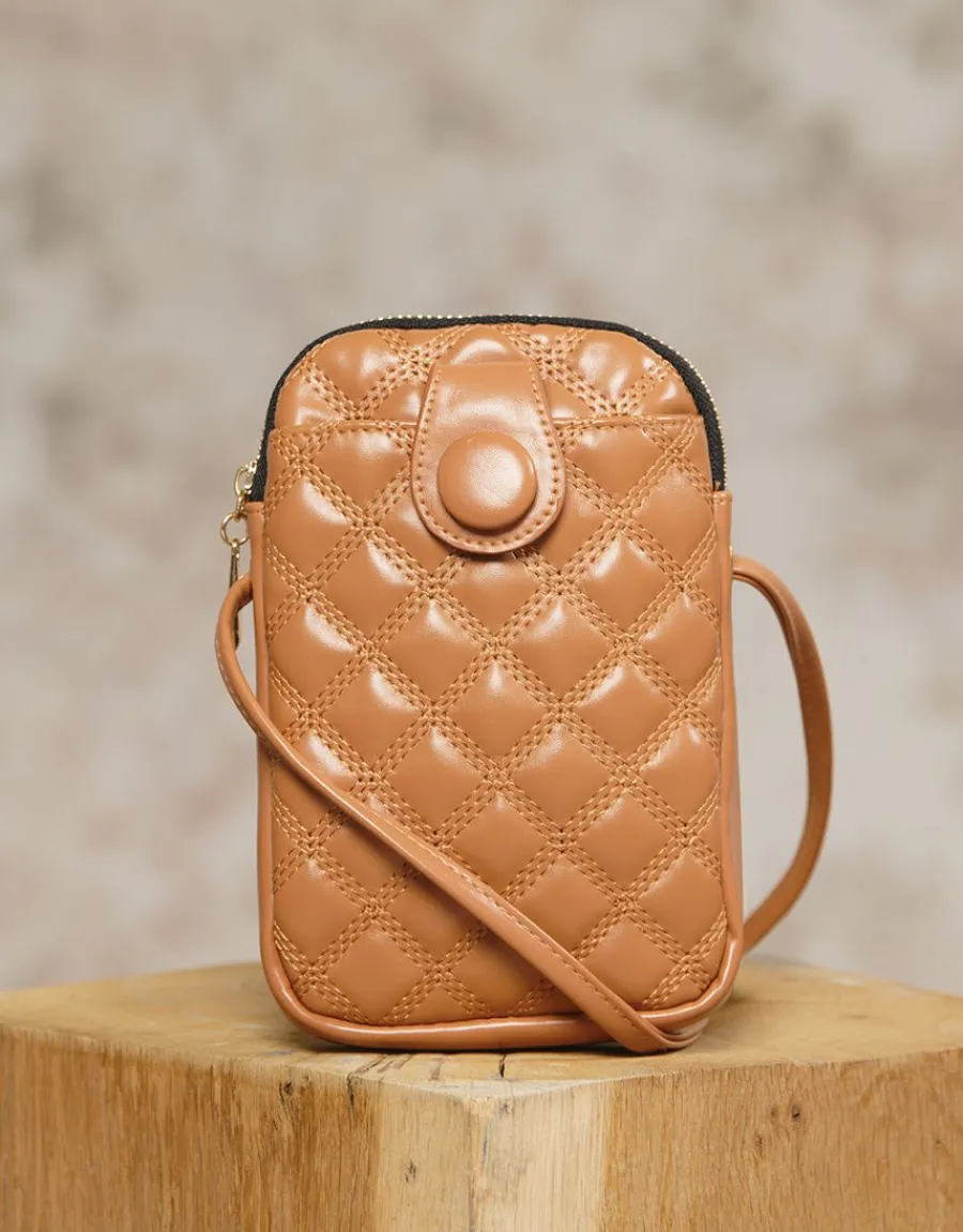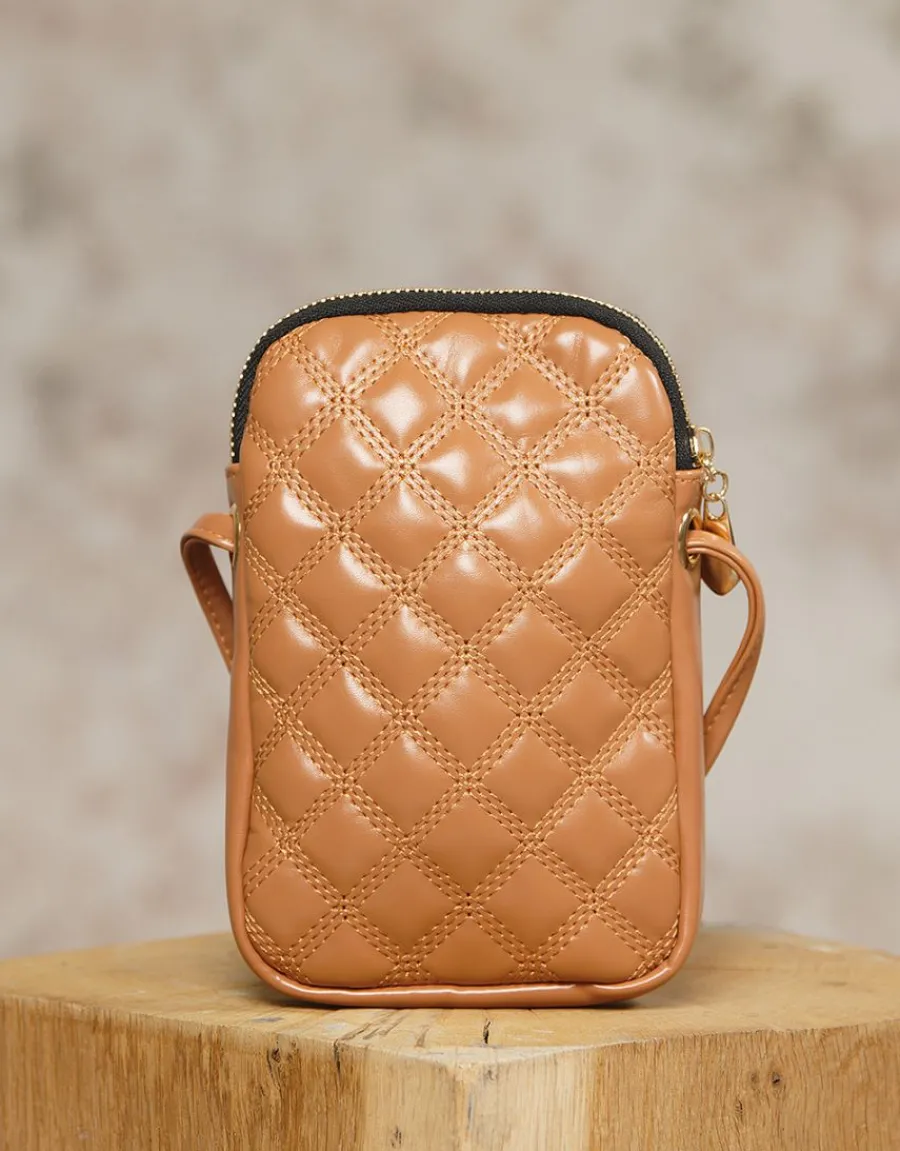 – Pochette simili-cuir matelassé camel à fine bandoulière