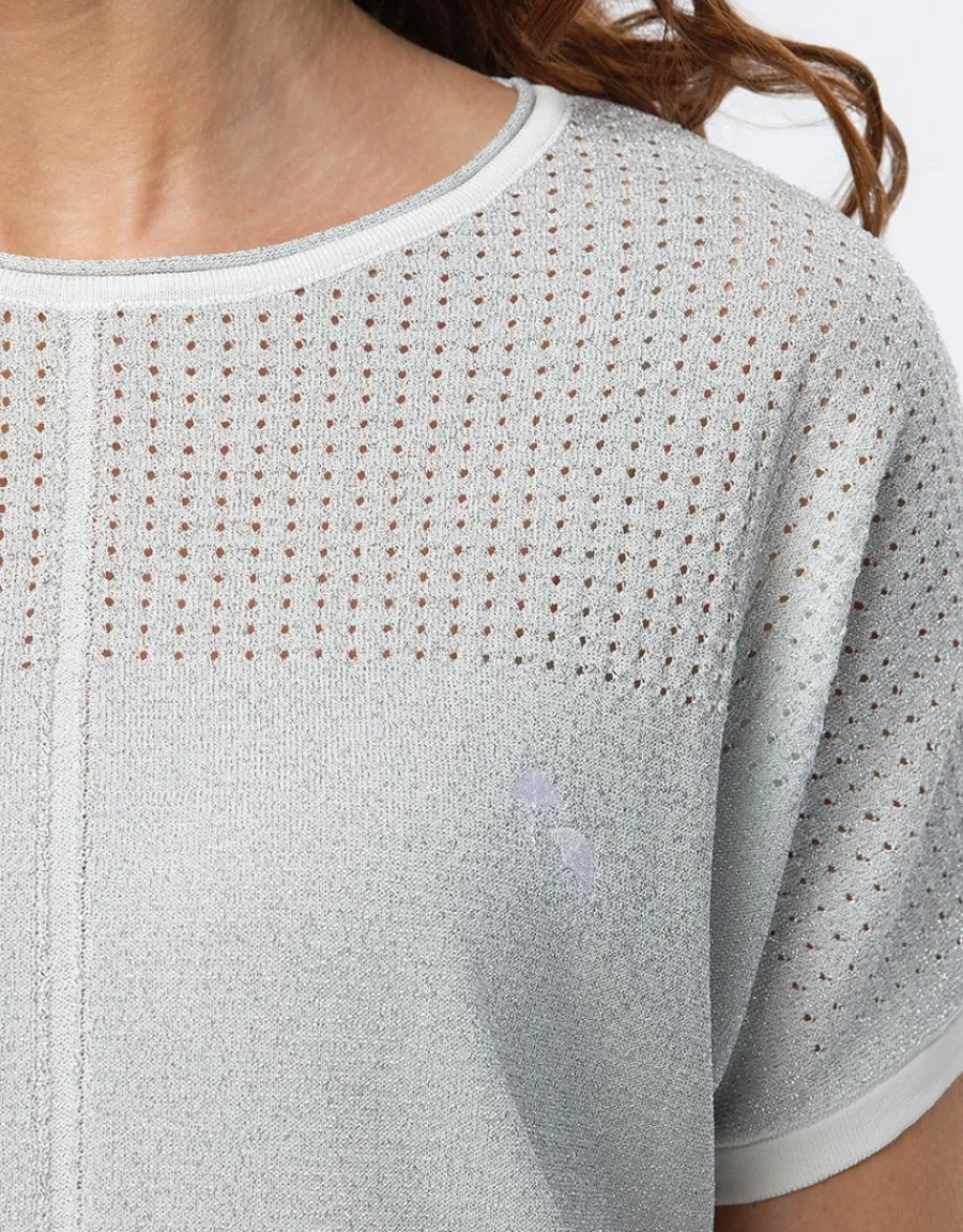 Le pull argenté à manches courtes de la marque Christine Laure est un choix élégant et contemporain pour votre garde-robe. Sa coupe droite assure un tombé fluide tandis que l’encolure ronde lui confère une allure classique et chic. Confectionné dans une maille fine et douce, ce pull offre un confort optimal tout au long de la journée. Le détail qui le distingue est une délicate broderie argentée au niveau de la poitrine, ajoutant une touche subtile de sophistication. Ce modèle est parfait pour passer d’une journée décontractée à une soirée plus habillée, se mariant facilement avec un jean ou une jupe. Avec une longueur de 59 cm pour la taille 1, il s’adapte à différentes morphologies tout en mettant en valeur la silhouette. Sa composition assure non seulement une douceur au toucher, mais garantit également une belle tenue. Kristel, mesurant 1,76 m, porte une taille 1, démontrant ainsi la polyvalence et l’adaptabilité de ce pull. Ce modèle est idéal pour celles qui recherchent un vêtement à la fois confortable et tendance, qui se démarque grâce à ses détails raffinés sans être ostentatoires.