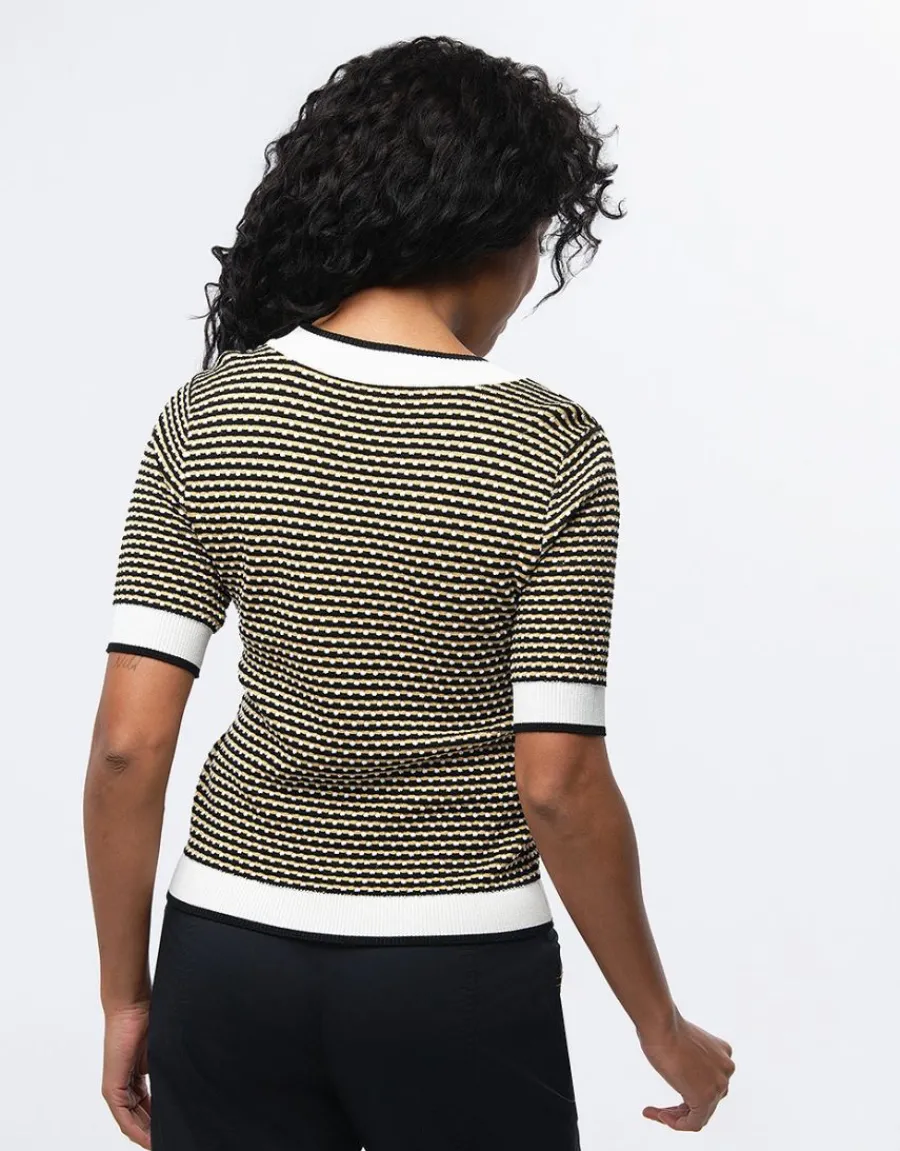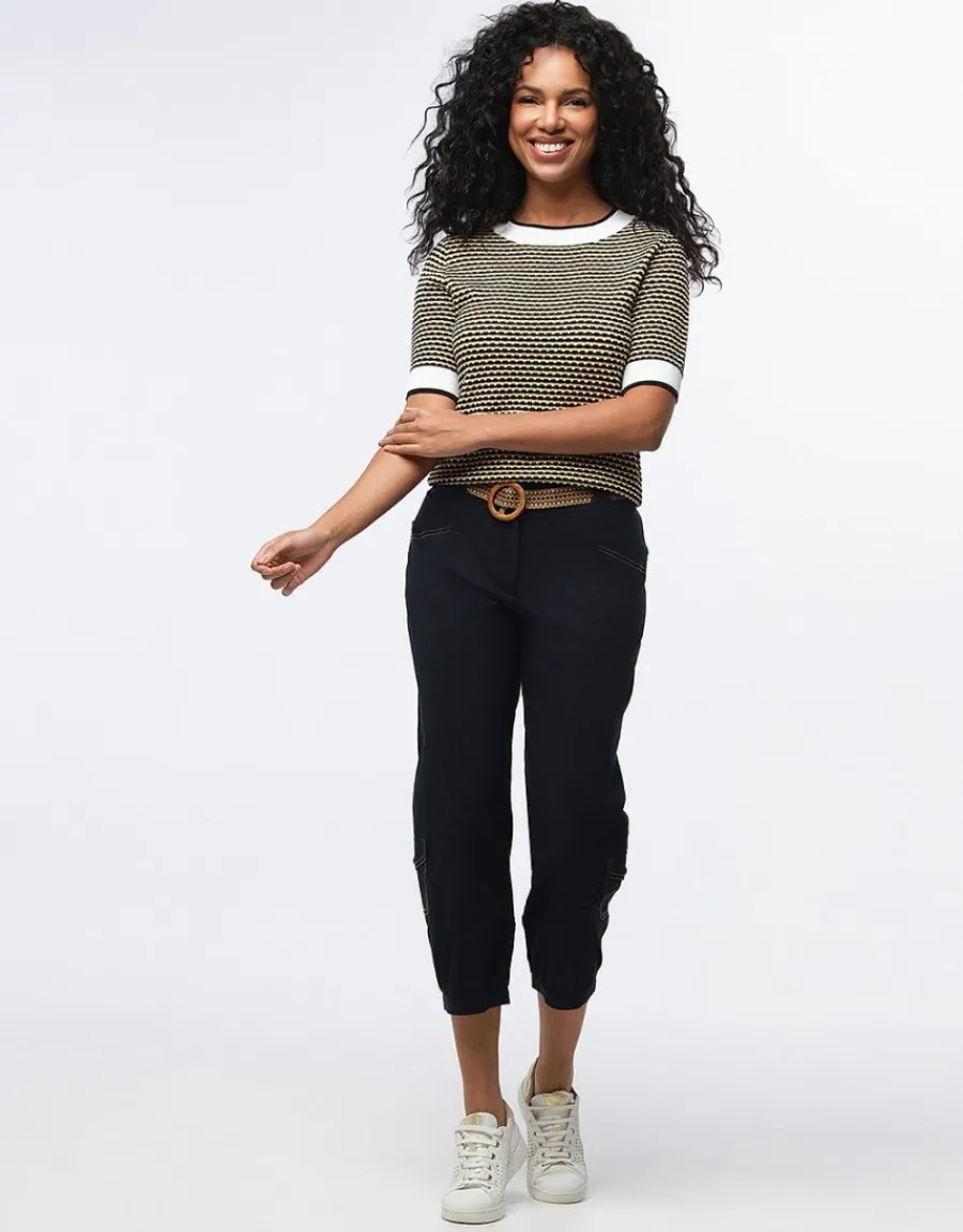 Ce pull à manches courtes de la marque Christine Laure se distingue par son design élégant et sa confection raffinée. Fabriqué en maille fantaisie, il présente un motif rayé noir et beige orné de pois blancs, ajoutant une touche de douceur à une silhouette moderne. Son col rond et sa coupe droite offrent un confort optimal tout en mettant en valeur la silhouette. Les manches courtes rendent ce modèle parfait pour les journées plus chaudes, tandis que le bord-côte blanc au niveau du col et des emmanchures rehausse son style. Avec une longueur de 58 cm pour la première taille, ce pull reste pratique et polyvalent, s’adaptant facilement à diverses occasions. Que ce soit pour un déjeuner informel ou une sortie entre amis, il se marie bien avec un pantalon ou une jupe, apportant une touche de fraîcheur. Disponible en taille 1, ce modèle convient à diverses morphologies, apportant une note d’élégance à votre garde-robe. Juliana, mesurant 1,76m, illustre parfaitement le style de ce pull en le portant avec aisance. Sa composition garantit une texture agréable et durable au toucher. Optez pour ce pull polyvalent qui réponde à vos attentes de confort et de style.