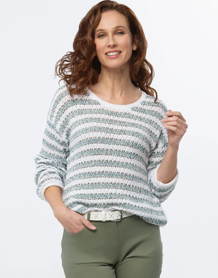 Ce pull rayé blanc et tilleul de la marque Christine Laure incarne un style marinière à la fois classique et tendance. Avec son encolure ronde et ses manches longues, il assure confort et élégance au quotidien. Sa maille douce ajourée offre une légèreté agréable, idéale pour les journées printanières ou les soirées estivales. La coupe droite garantit un tombé flatteur, s’adaptant aisément à différentes morphologies. Kristel, mesurant 1,76m, porte une taille 1, témoignant de la polyvalence de ce modèle. Ce pull s’associe facilement avec divers vêtements, allant des jeans aux jupes fluides, vous permettant de composer des looks à la fois décontractés et raffinés. La combinaison de matières, assure durabilité et confort, tout en étant facile d’entretien. Avec sa longueur de 60 cm pour la première taille, ce pull présente une coupe moderne, mariant élégance et praticité. Ce vêtement deviendra rapidement un incontournable de votre garde-robe, apportant une touche de fraîcheur et de légèreté à chacune de vos tenues.