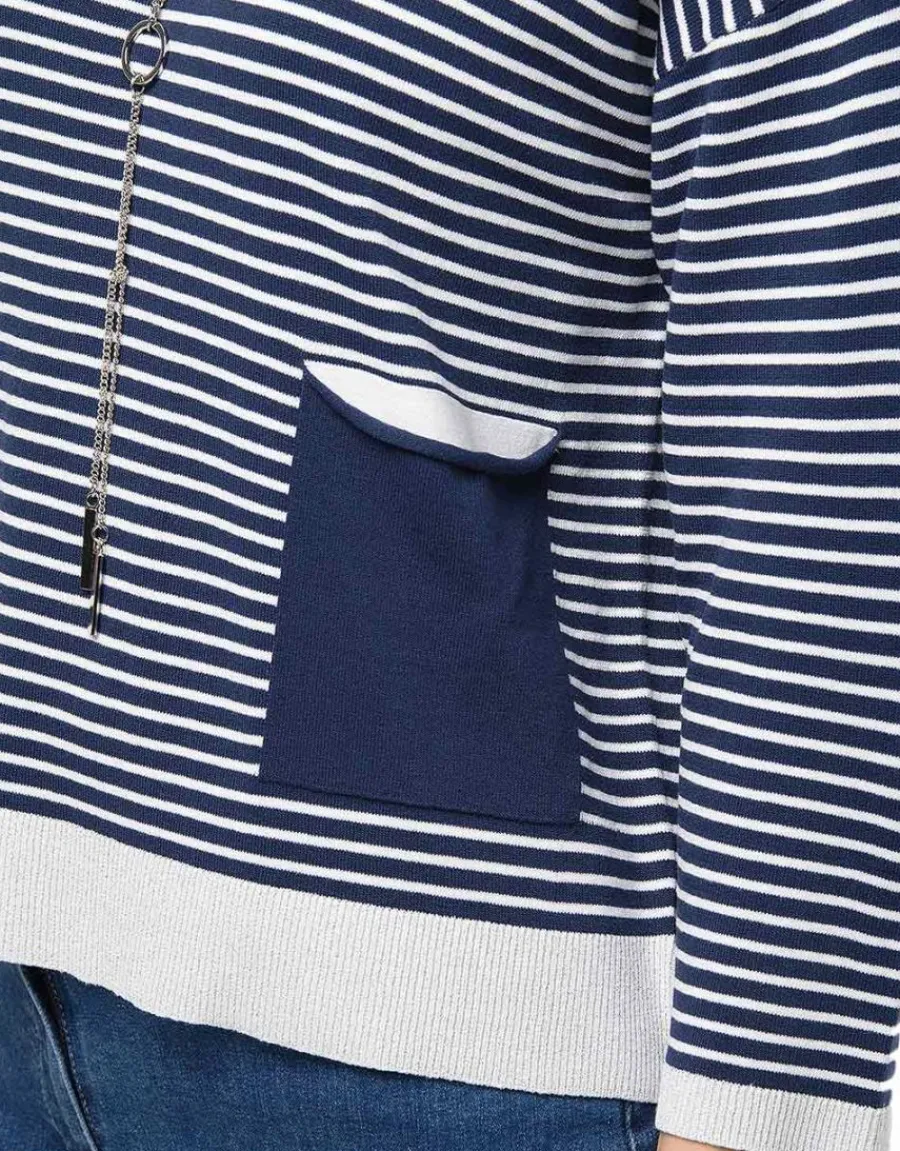 Même si vous avez déjà un pull marinière, vous ne pourrez pas résister ce modèle. Un peu oversize, légèrement raccourci, cette pièce renouvelle le genre avec bonheur. Détail mode : le collier sautoir intégré au pull.