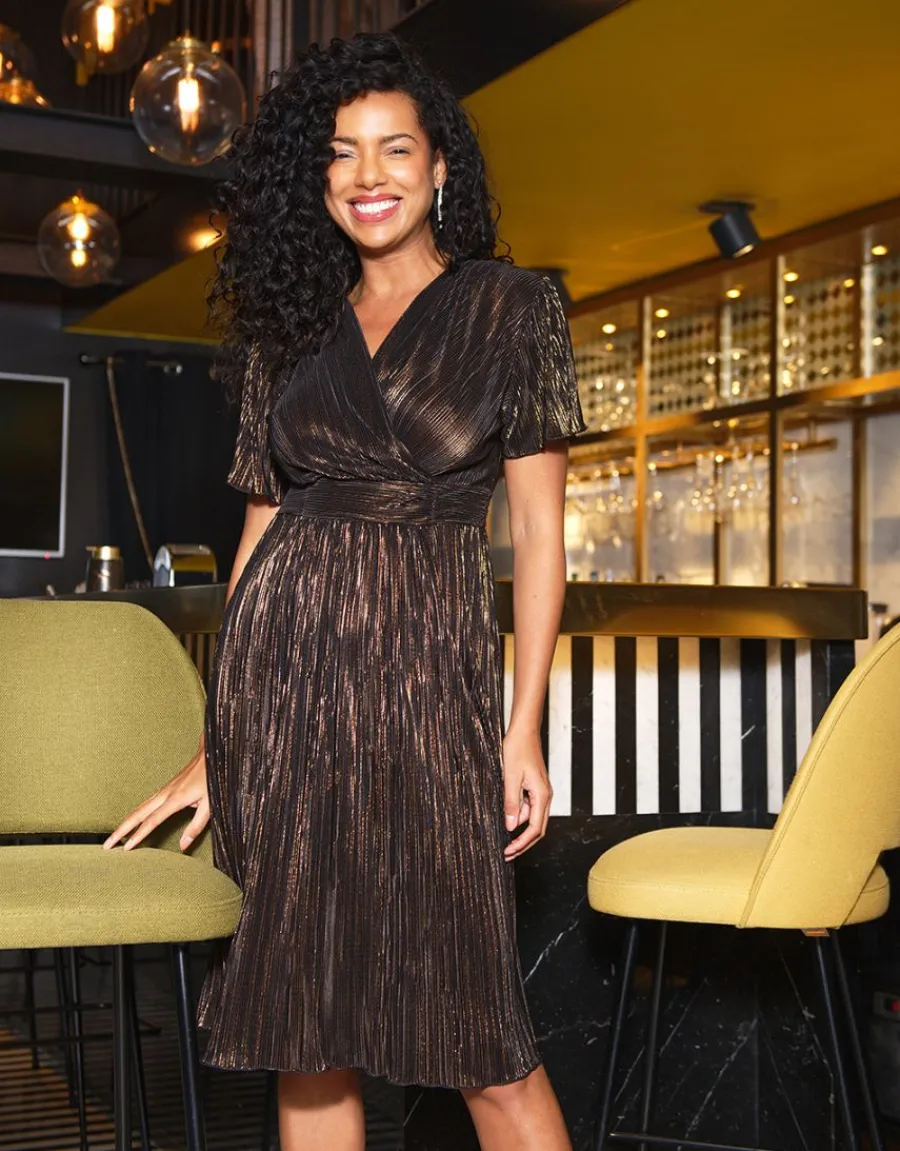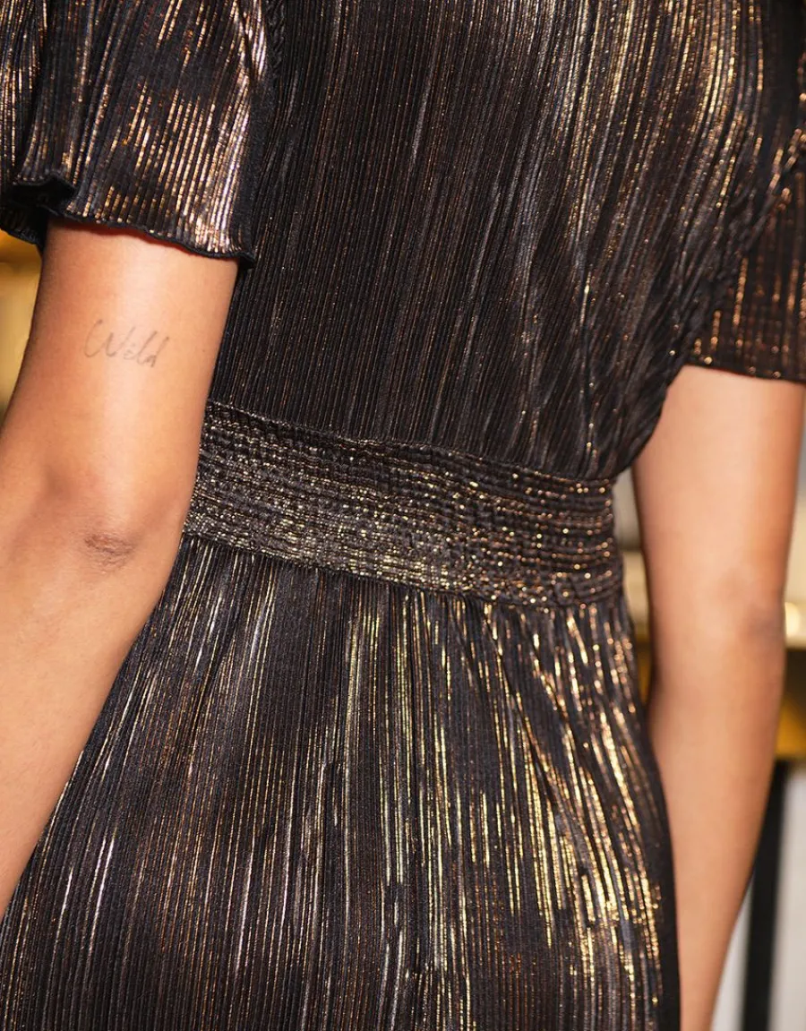 La robe drapée chic noir avec fils dorés est un véritable must-have pour toutes les occasions spéciales. Sa coupe resserrée sous la poitrine met en valeur la silhouette, tandis que le jupon évasé apporte une touche de féminité et d’élégance. Le col V style cache coeur et les manches courtes ajoutent une touche de sophistication à cette pièce intemporelle. Le noir avec des fils dorés apporte une touche de brillance subtile, parfaite pour briller en soirée. Conçue en 100% polyester, cette robe est à la fois confortable et agréable à porter. Que ce soit pour une soirée chic ou un événement spécial, cette robe sera votre alliée mode incontournable. Mesurant 1m75, Juliana porte une taille 1 et la longueur de la robe est de 104 cm du haut de l’épaule jusqu’en bas pour la première taille. Avec cette robe drapée chic noir, soyez prête à faire tourner les têtes et à vous sentir belle et confiante en toutes circonstances.