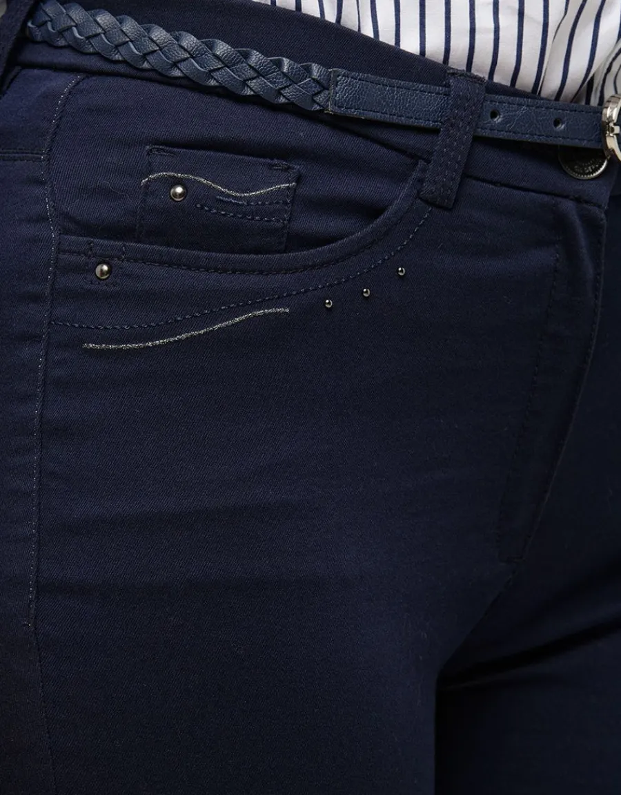 Le pantalon marine en coton est un incontournable de la garde-robe féminine. Sa coupe « jean » apporte une touche décontractée et tendance à toutes vos tenues. Avec ses détails brodés, ce pantalon slim est à la fois élégant et original. Sa taille légèrement basculée sur l’avant assure un confort optimal tout au long de la journée. Fabriqué dans un coton mélangé avec une touche de stretch, ce pantalon bleu est à la fois doux et résistant. Il est doté de 2 poches cavalières à l’avant et de 2 poches plaquées au dos pour un côté pratique. Les fines broderies argentées et bleues sur les poches ajoutent une touche de sophistication à l’ensemble. Ce pantalon marine coton est parfait pour un look « western urbain » qui saura vous démarquer avec style. Sa composition en 62% coton, 36% polyester et 2% élasthanne garantit une qualité irréprochable. Avec une longueur de 99 cm du haut jusqu’en bas pour la première taille, ce pantalon s’adapte à toutes les morphologies. Que vous le portiez avec un t-shirt basique pour un look décontracté ou avec une chemise pour une tenue plus habillée, ce pantalon marine coton sera votre allié mode en toutes circonstances. N’hésitez plus et ajoutez-le à votre dressing pour un style résolument moderne et tendance.
