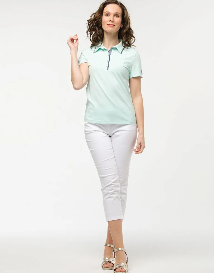 Must-have de tous les outfits sport, le polo en maille piquée se décline dans un coloris vert pastel très lumineux. Ce modèle est créé dans une belle maille piquée 100% coton, avec les finitions soignées qu’on apprécie chez Christine Laure : un galon marine borde le col, ainsi que la patte et la sous patte de boutonnage, tandis que sur la poche poitrine, on trouve un fin logo brodé.