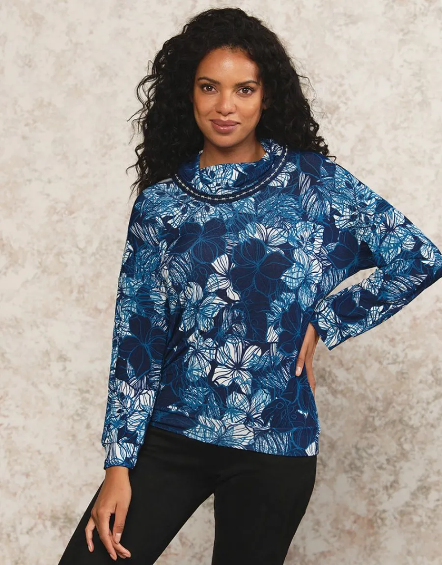 Découvrez ce T-shirt bleu à motif floral, coupe droite et manches longues. Son encolure ronde est agrémentée d’un col boule légèrement lâche et de détails liseré épais bleu avec touches dorées. Le fond bleu est orné d’un motif feuillage fondu bleu et blanc, apportant une touche de fraîcheur à ce vêtement. Les bords-côtes aux manches et au bas du t-shirt ajoutent une finition soignée. Confectionné dans un tissu doux et stretch, ce t-shirt est à la fois confortable et élégant. Parfait pour la saison automnale, il vous tiendra chaud tout en vous assurant un look tendance. À porter directement sur la peau pour profiter pleinement de sa douceur. Mesurant 1,76m, Juliana porte une taille 1. Sa composition en 95% polyester et 5% élasthanne garantit à la fois confort et qualité. Avec une longueur de 58,5 cm pour la première taille, ce t-shirt s’adaptera parfaitement à votre morphologie. Optez pour ce t-shirt doux motif bleu pour un look à la fois décontracté et raffiné.