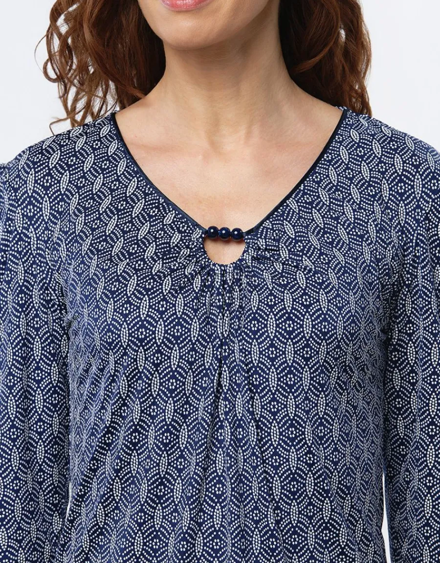 Élégant et contemporain, ce t-shirt imprimé, signé Christine Laure, allie esthétisme et confort. Son design subtil marine et blanc crée une fusion parfaite entre la fantaisie et la sophistication, ce qui le rend idéal pour une variété d’occasions. La coupe près du corps met en valeur la silhouette tout en assurant un maintien agréable. L’encolure en V en goutte d’eau, ornée de trois délicates perles bijoux, apporte une touche raffinée qui se démarque sans être ostentatoire. Les manches 3/4 ajoutent une note de douceur, rendant le vêtement adapté à diverses saisons. Confectionné en maille légère et extensible, ce t-shirt permet une liberté de mouvement tout en restant chic. Idéal pour une tenue décontractée ou pour un look plus travaillé, ce modèle se marie aisément avec un pantalon ajusté ou une jupe élégante. Avec une longueur de 60 cm pour la première taille, il offre un tombé flatteur, quel que soit votre style. Kristel, qui mesure 1,76 mètre, porte ici une taille 1, ce qui illustre la polyvalence de cette pièce. Ce t-shirt est bien plus qu’un simple vêtement, c’est une véritable déclaration de style, parfaitement conçu pour ajouter une touche d’élégance à votre garde-robe. Christine Laure a su allier confort et mode, faisant de ce modèle un incontournable pour toutes celles qui recherchent l’originalité tout en préservant leur élégance naturelle.