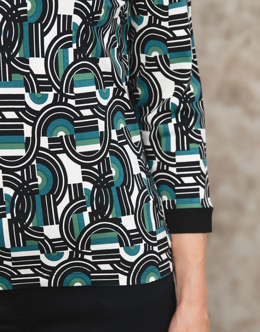 Ce T-shirt noir, blanc et bleu à motifs est un véritable incontournable pour votre garde-robe. Sa coupe droite et son encolure ronde épaisse avec une patte de boutonnage fermée par 3 points lui confèrent une allure à la fois décontractée et élégante. Les manches 7/8 ème avec des bords-côtes noirs ajoutent une touche de style supplémentaire. Le fond écru et les motifs géométriques noirs, bleus et verts apportent une touche de couleur et d’originalité à ce T-shirt. Fabriqué dans un tissu stretch et souple, il vous offrira un confort optimal tout au long de la journée. Que vous le portiez avec un jean pour un look décontracté ou avec une jupe pour une tenue plus habillée, ce T-shirt s’adaptera à toutes vos envies. Kristell, qui mesure 1m75, porte une taille 1 de ce T-shirt. Sa composition en 95% viscose et 5% élasthanne garantit une qualité et une durabilité exceptionnelles. Avec une longueur de 59 cm pour la première taille, ce T-shirt sera parfait pour toutes les occasions, que ce soit pour une journée au bureau ou une sortie entre amis. Offrez-vous ce T-shirt vert noir motif et ajoutez une touche de style à votre tenue.