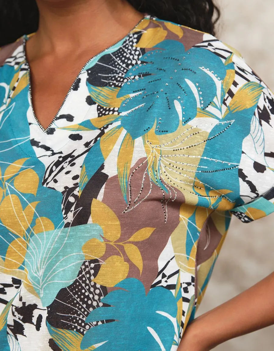 Le T-shirt vert strass est un incontournable de votre garde-robe estivale. Avec son imprimé vert, bleu et marron, il apporte une touche de fraîcheur et de couleur à vos tenues. Sa coupe droite met en valeur votre silhouette, tandis que son encolure en V ornée d’un liseré argenté ajoute une touche d’élégance. Les manches courtes avec revers donnent un côté décontracté et tendance à ce T-shirt. Les strass dispersés sur le devant apportent une touche de lumière et de brillance à l’ensemble. Le bas élastiqué permet un ajustement parfait à votre taille. Que vous le portiez avec un jean pour un look décontracté ou avec une jupe pour une tenue plus sophistiquée, ce T-shirt sera votre allié mode de la saison. Fabriqué à partir de 100% polyester, il est à la fois confortable et facile d’entretien. Avec une longueur de 61 cm pour la première taille, il conviendra parfaitement à toutes les morphologies. Adoptez le T-shirt vert strass pour un look frais et lumineux cet été. Juliana, qui mesure 1,76m, porte du 38 et le porte à merveille.