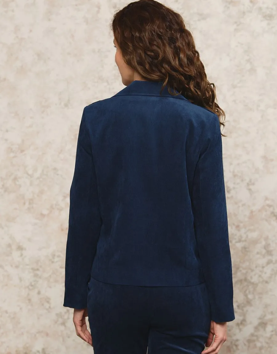 Laissez vous séduire par cette veste style blouson motard en velours bleu nuit. Le velours côtelé fin apporte une touche d’élégance à cette pièce, avec des finitions invisibles pour un rendu soigné. Sa coupe droite et son large col à revers cranté ajoutent une touche de modernité, accentuée par les détails en points métalliques aux bords. Les manches longues et la fermeture par un zip apportent une touche de praticité, tandis que les 2 poches raglan offrent un espace de rangement supplémentaire. La veste est entièrement doublée pour un confort optimal, avec des détails sur les épaules qui structurent la silhouette. Le tissu doux et souple garantit un port agréable tout au long de la journée. Le velours fait son come-back en se déclinant dans un style blouson motard, idéal pour apporter une touche de sophistication à vos tenues. Cette veste se marie parfaitement avec un jean pour un look décontracté, ou en total look avec le pantalon en velours assorti pour un ensemble harmonieux. Kristell, qui mesure 1,76m, porte une taille 38 pour une coupe ajustée et élégante. Composition : 87% polyester, 11% polyamide, 2% élasthanne. La doublure est entièrement en polyester pour un confort optimal. La longueur de la veste est de 58 cm pour la première taille, offrant une coupe moderne et flatteuse. Cette veste velours côtelé bleu est un incontournable de la saison, alliant style et confort pour un look tendance en toute occasion.